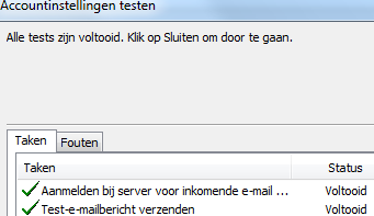Om te controleren of alles werkt moet u klikken op Accountinstellingen testen… rechtsboven. Wanneer beide taken met succes zijn voltooid drukt u op sluiten en vervolgens op volgende en voltooien.