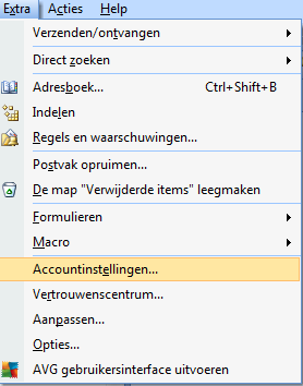 Om te beginnen moet er in outlook een account aangemaakt worden. Klik bovenaan in uw outlook op Extra en vervolgens op Accountinstellingen.