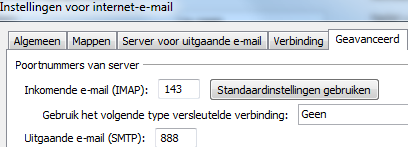 Ga naar het tabblad Geavanceerd en vul hier bij Uitgaande e-mail (SMTP): 888 in en klik vervolgens op ok.